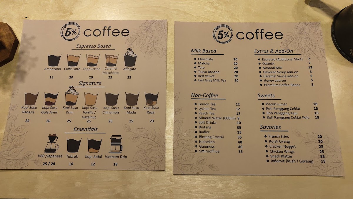 As for drinks, Five Percent excels with a wide selection of shakes, all at IDR 20,000 each. Whether you fancy the rich Belgian Chocolate Shake or the refreshingly unique Tokyo Banana Shake, there’s an option for every mood. For coffee enthusiasts, the V60 Drip Coffee and Vietnam Drip Coffee presents a ritualistic brewing experience, bringing forth nuances in flavor that will delight the discerning palate.